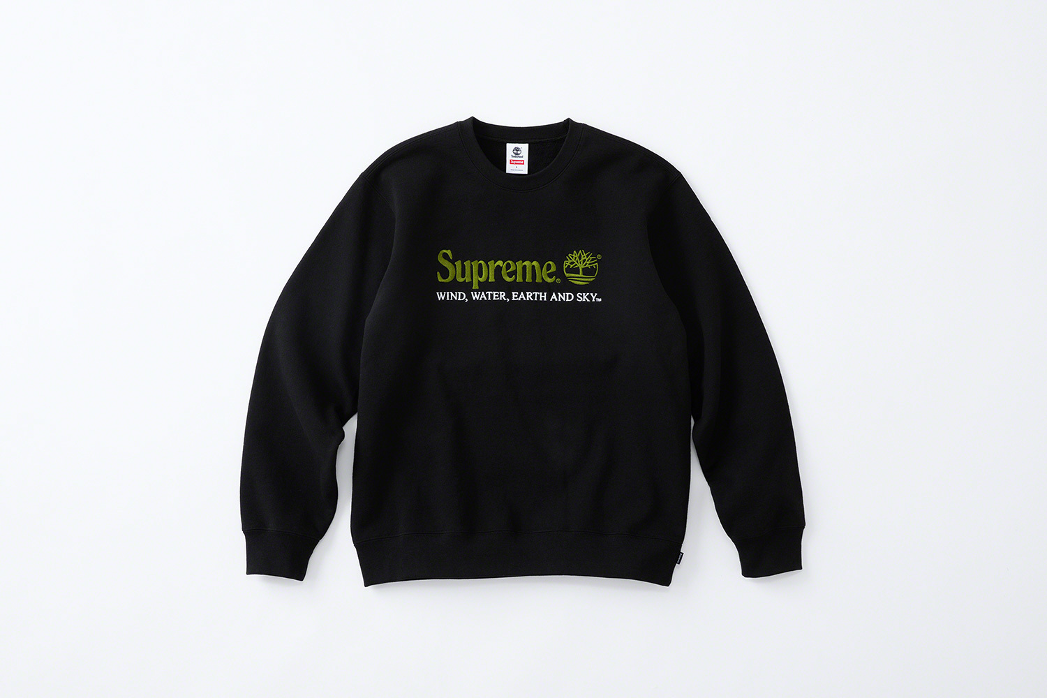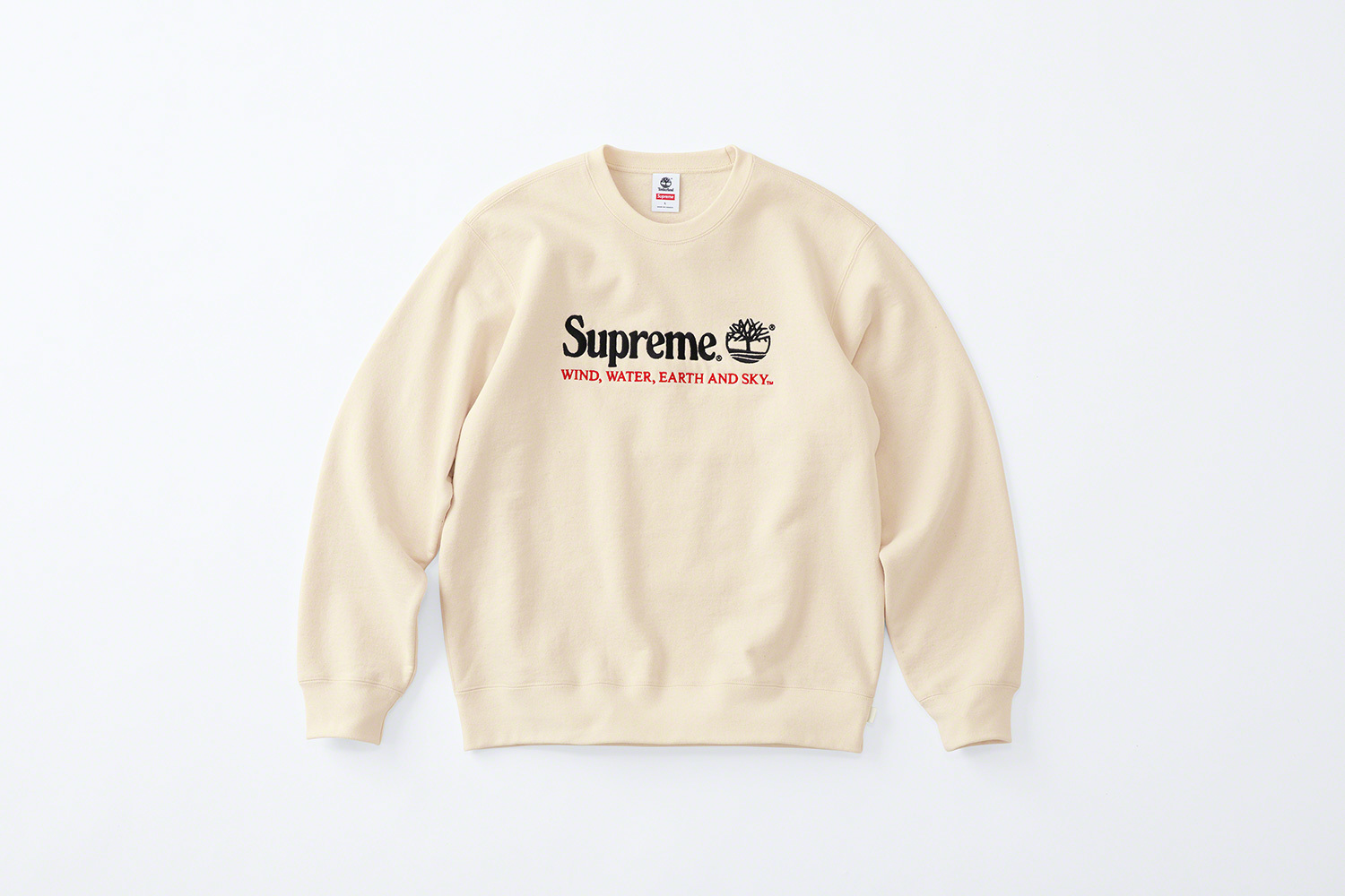 For this drop, Timberland’s signature “WIND, WATER, EARTH AND SKY” logo gets the Supreme twist, seen embroidered on the crewnecks and 6-panel hats also included in this collection. The crewneck is offered in black, olive, red, and cream, while the hats come in black, navy, red, yellow, olive, and white.
