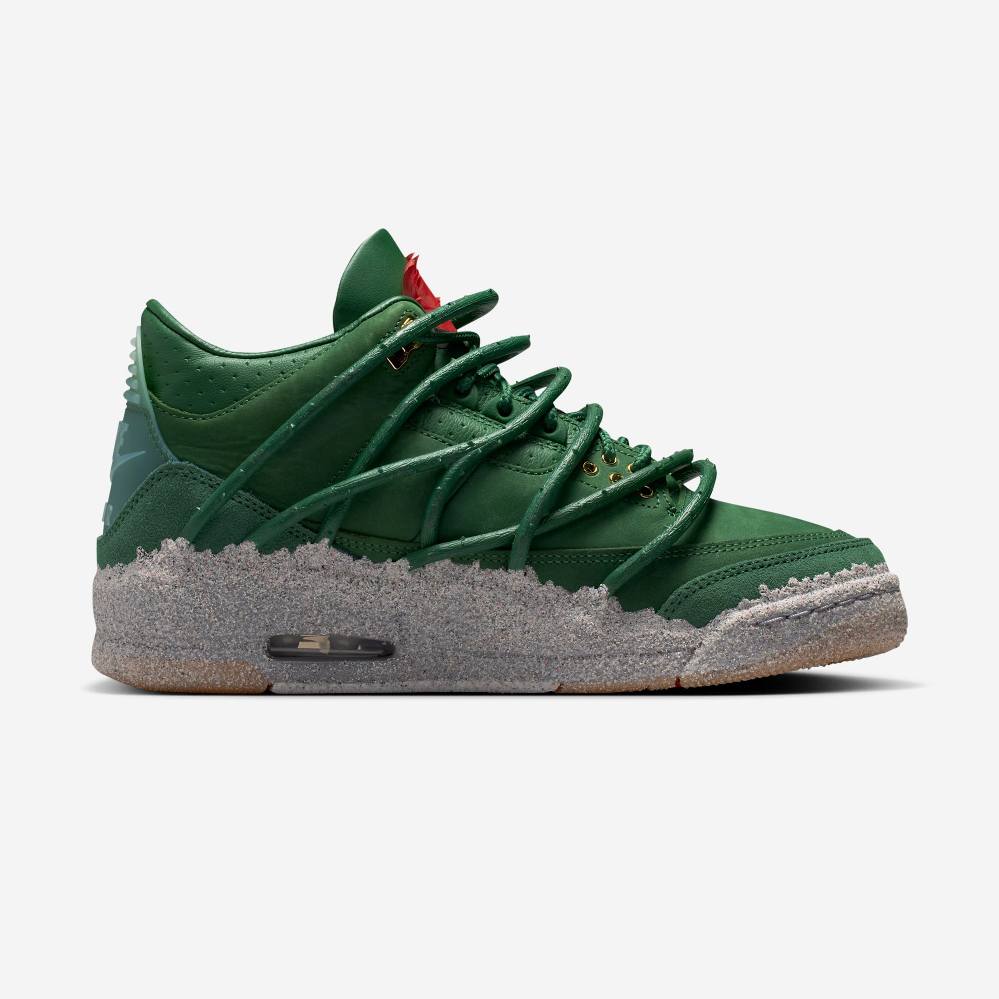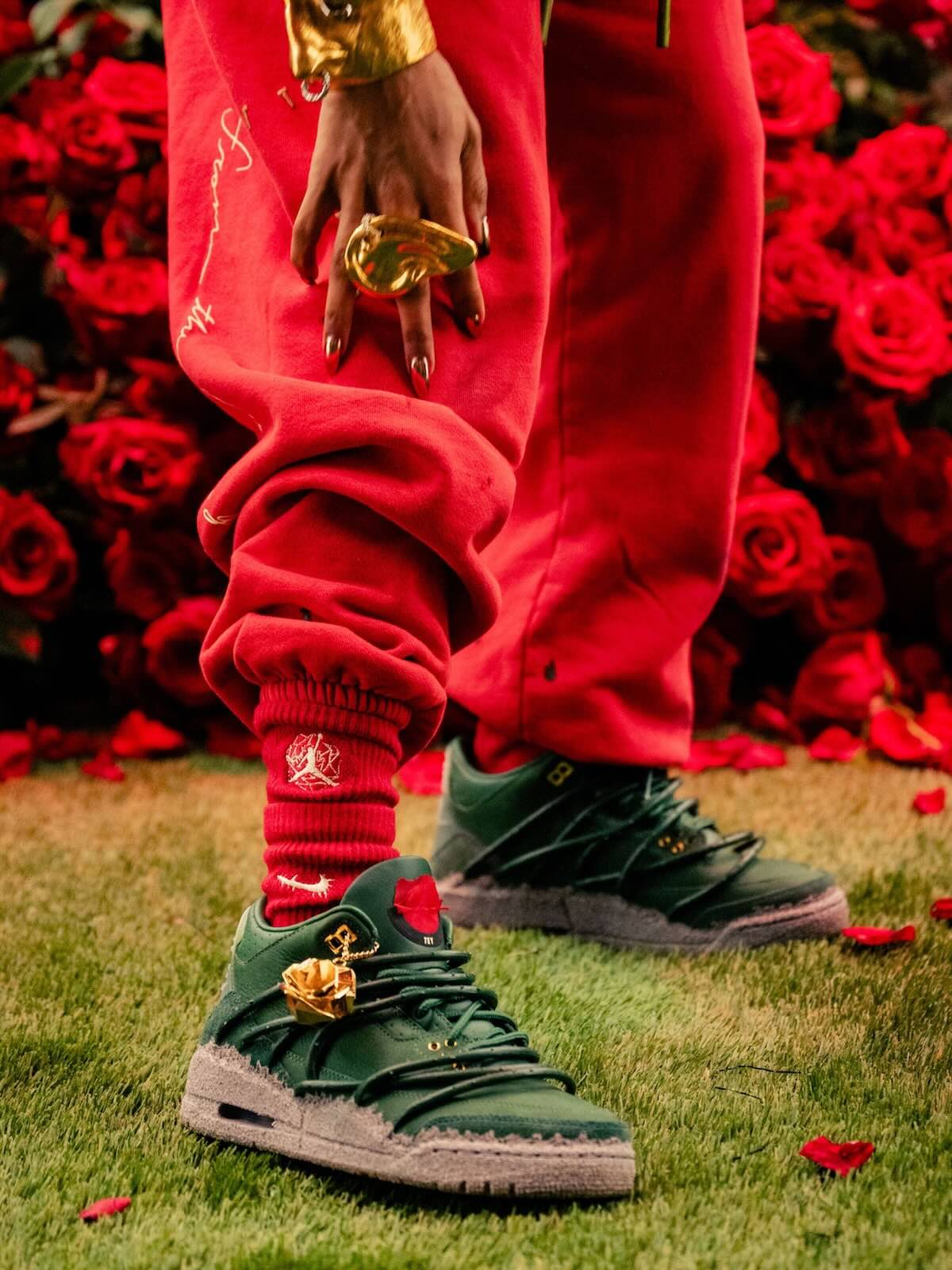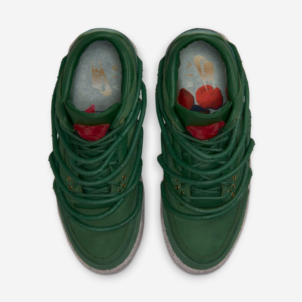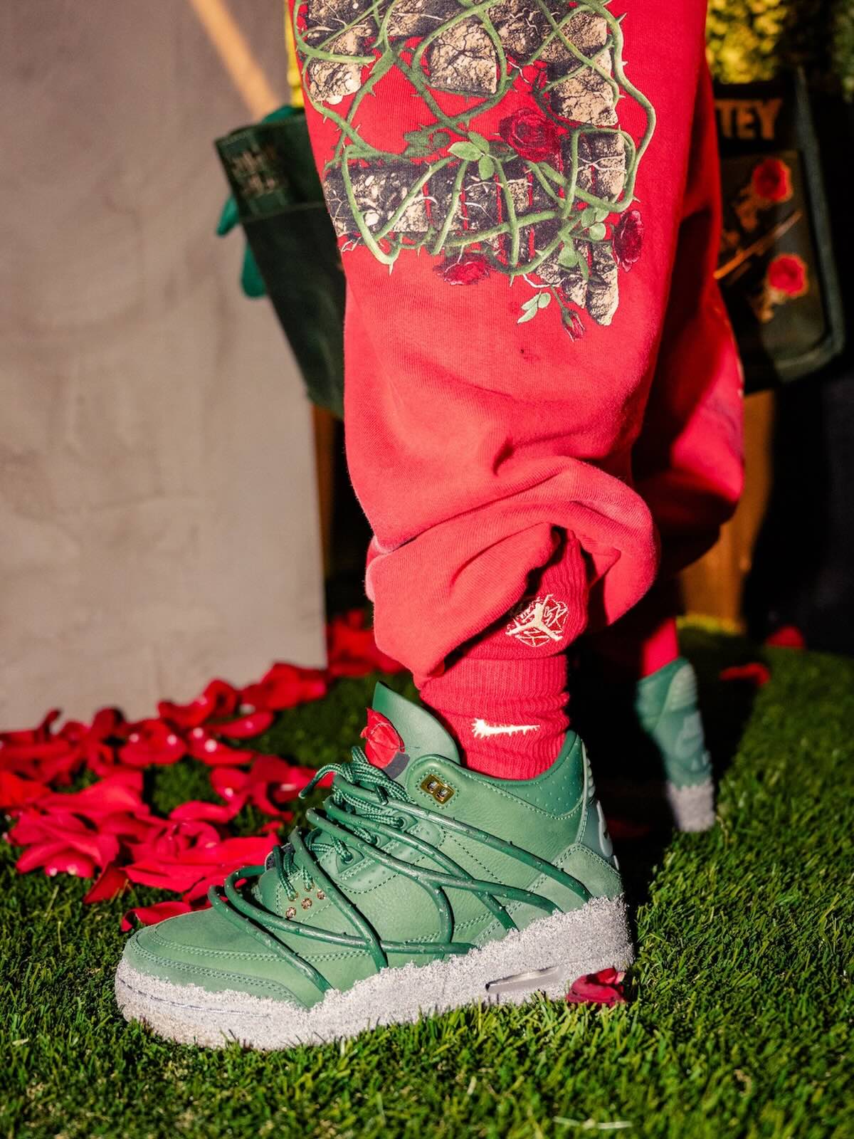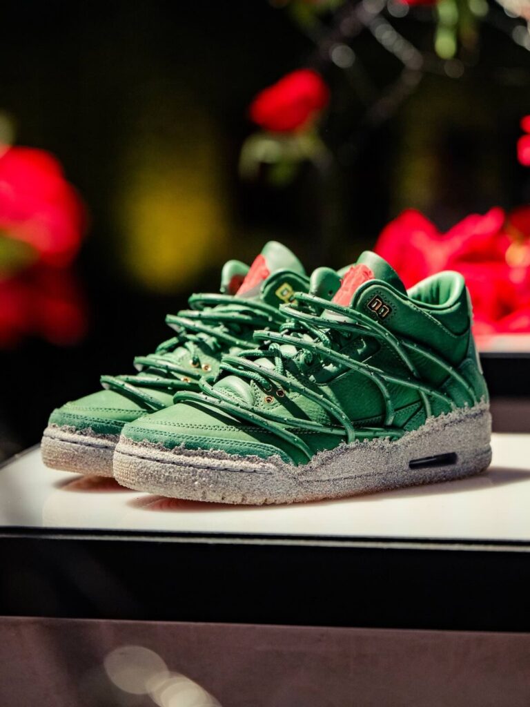 The pair features prickly green thorn vines wrapping around a matching green-hued leather upper with a concrete-finished midsole, reflecting her journey as a rose emerging from concrete, starting from the bottom and creating a successful career for herself with resilience and perseverance. These vines can be clipped off for a more traditional look, though they cannot be reattached once removed. Additional details include metallic gold eyelets, a gold-colored rose lace charm, and a Fire Red rose emblem on the tongue.