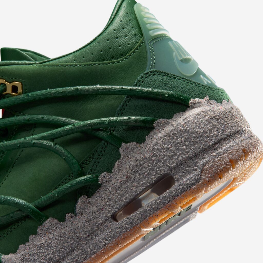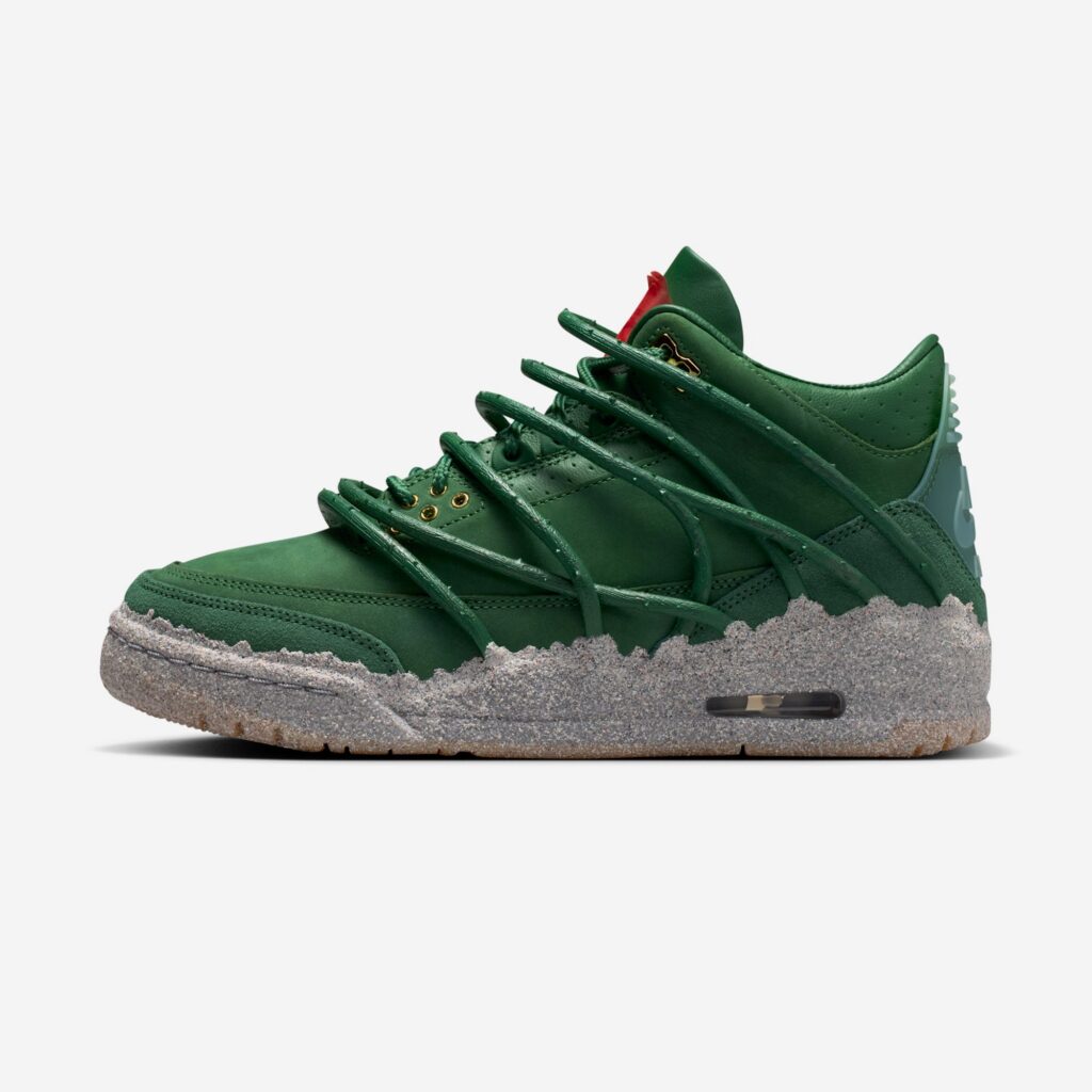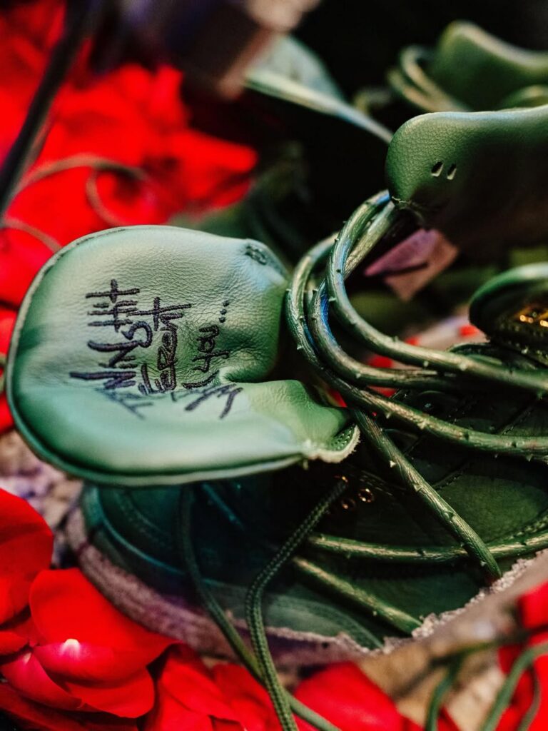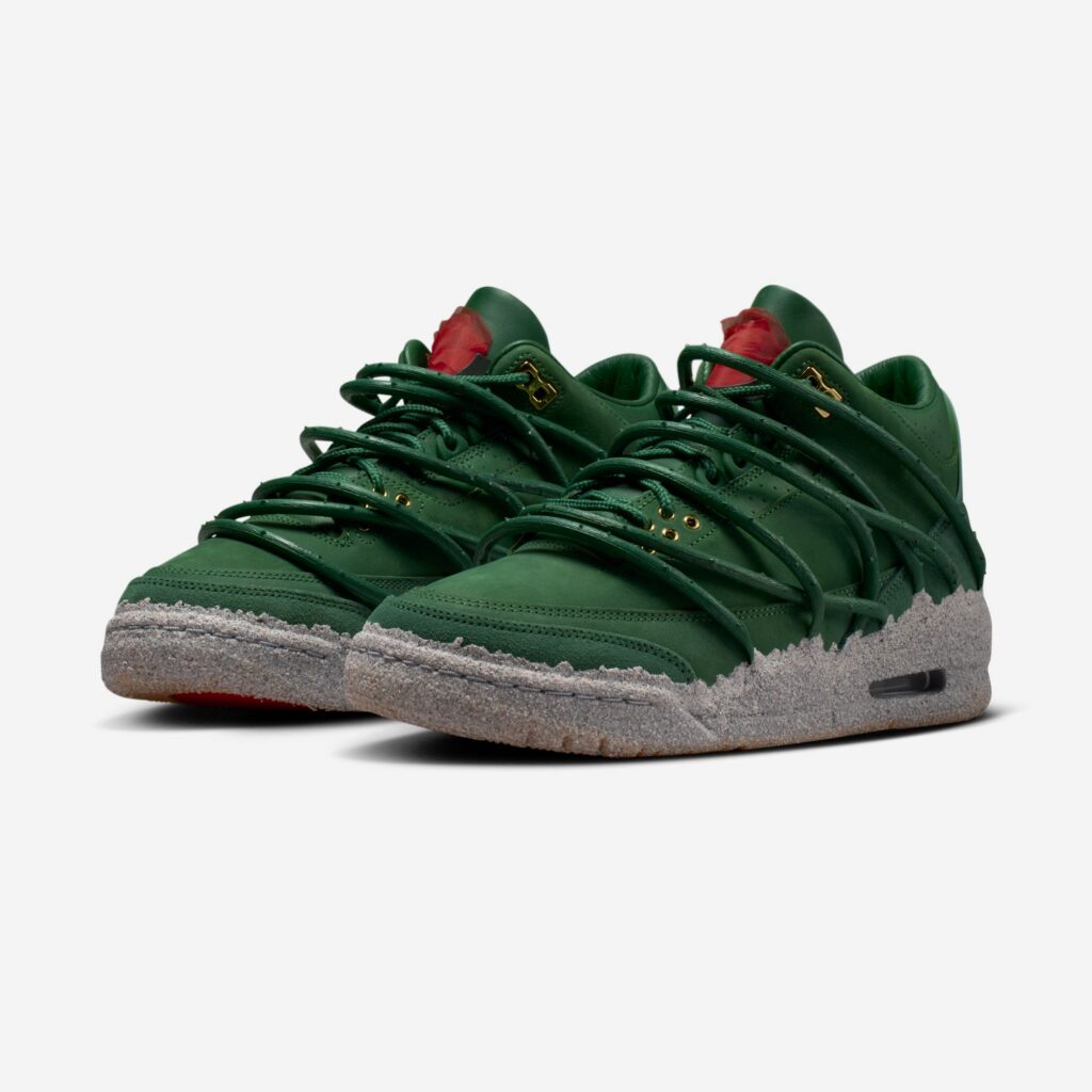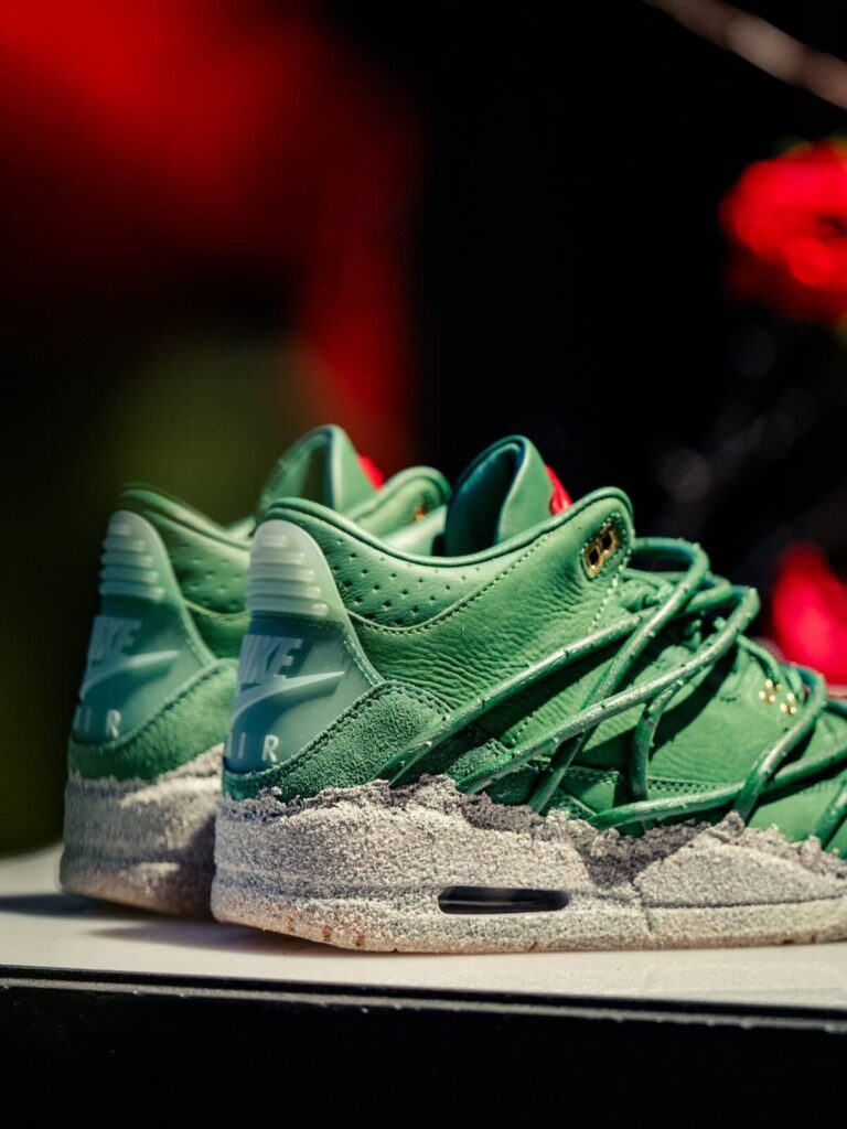 The pair features prickly green thorn vines wrapping around a matching green-hued leather upper with a concrete-finished midsole, reflecting her journey as a rose emerging from concrete, starting from the bottom and creating a successful career for herself with resilience and perseverance. These vines can be clipped off for a more traditional look, though they cannot be reattached once removed. Additional details include metallic gold eyelets, a gold-colored rose lace charm, and a Fire Red rose emblem on the tongue.