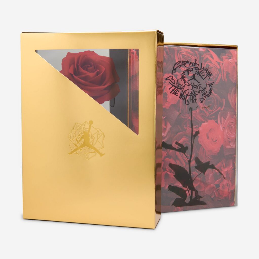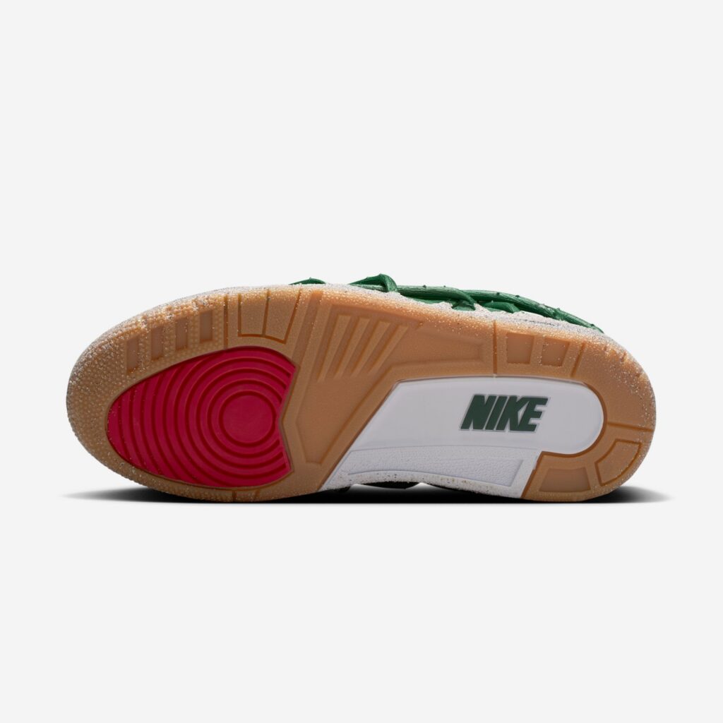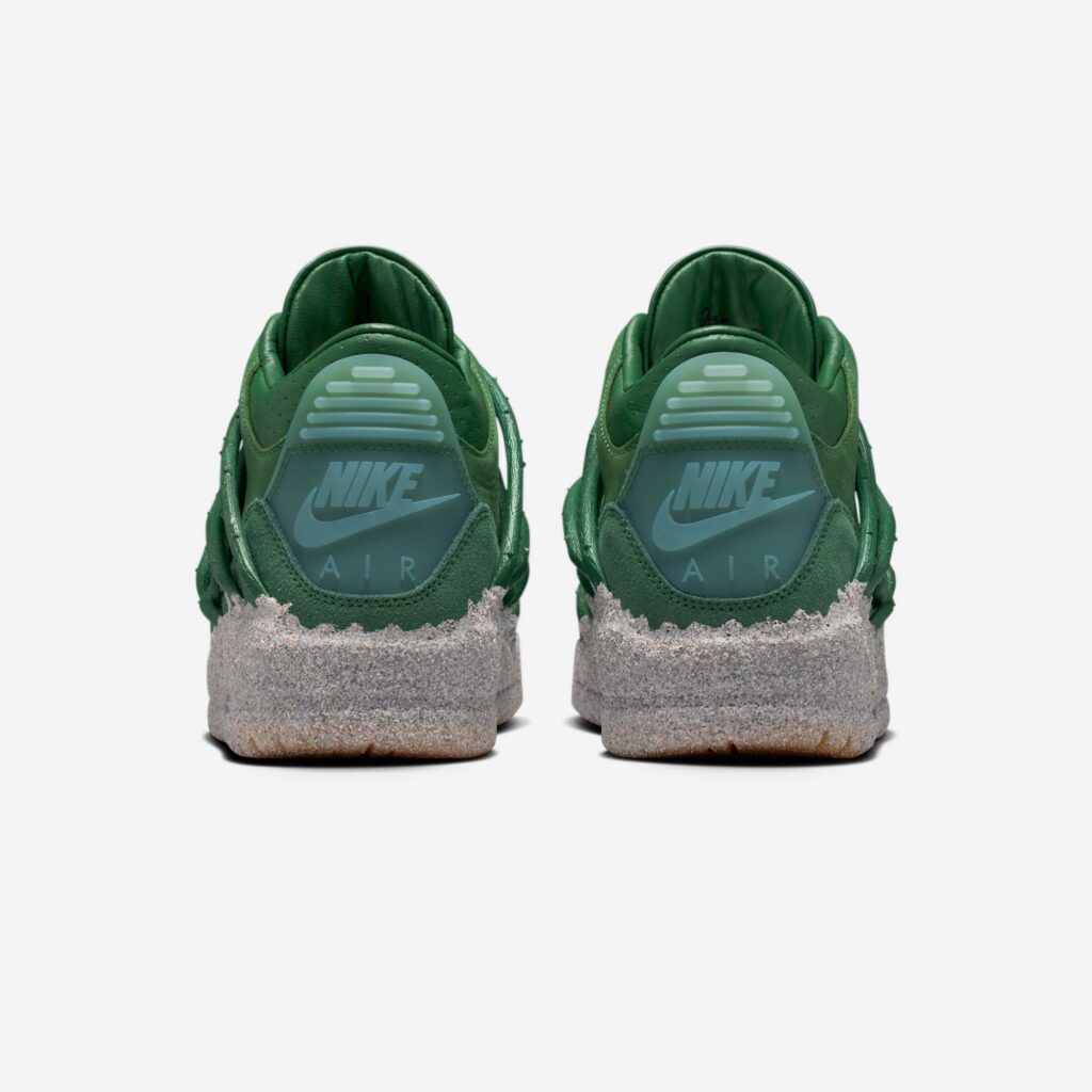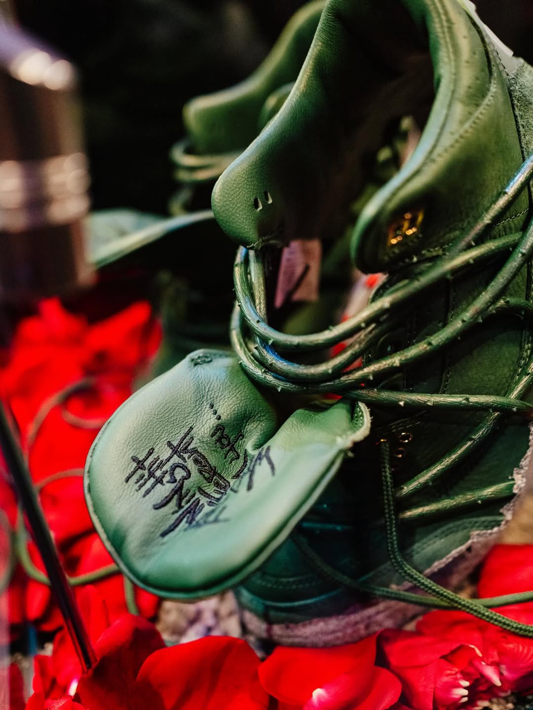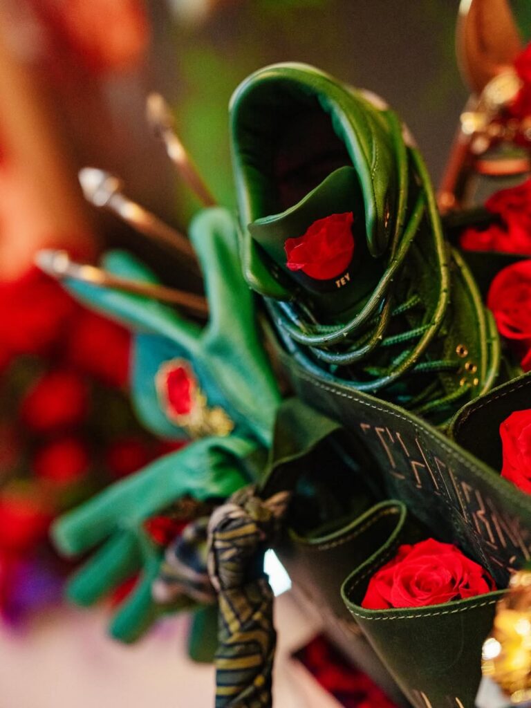 The pair features prickly green thorn vines wrapping around a matching green-hued leather upper with a concrete-finished midsole, reflecting her journey as a rose emerging from concrete, starting from the bottom and creating a successful career for herself with resilience and perseverance. These vines can be clipped off for a more traditional look, though they cannot be reattached once removed. Additional details include metallic gold eyelets, a gold-colored rose lace charm, and a Fire Red rose emblem on the tongue.