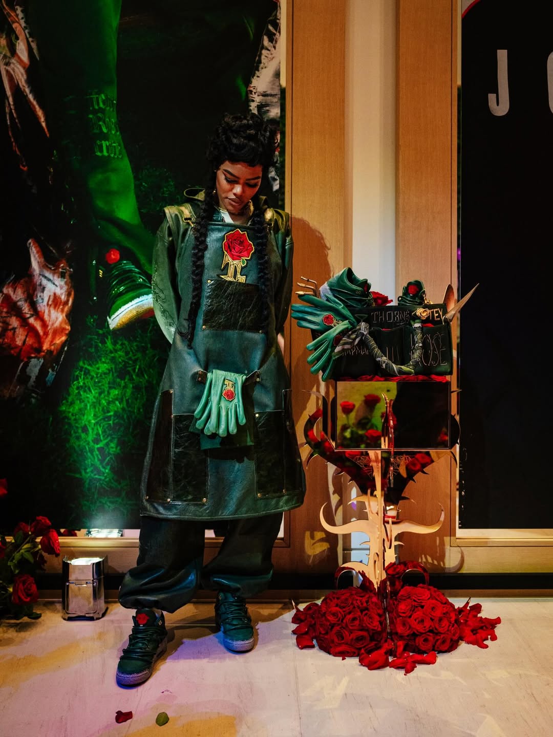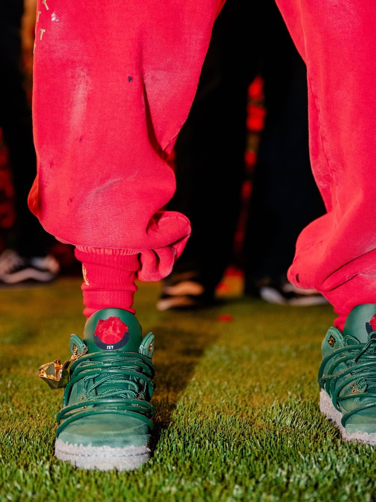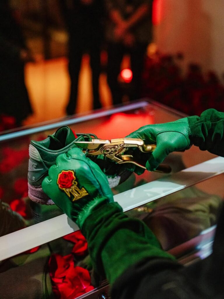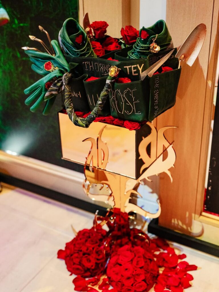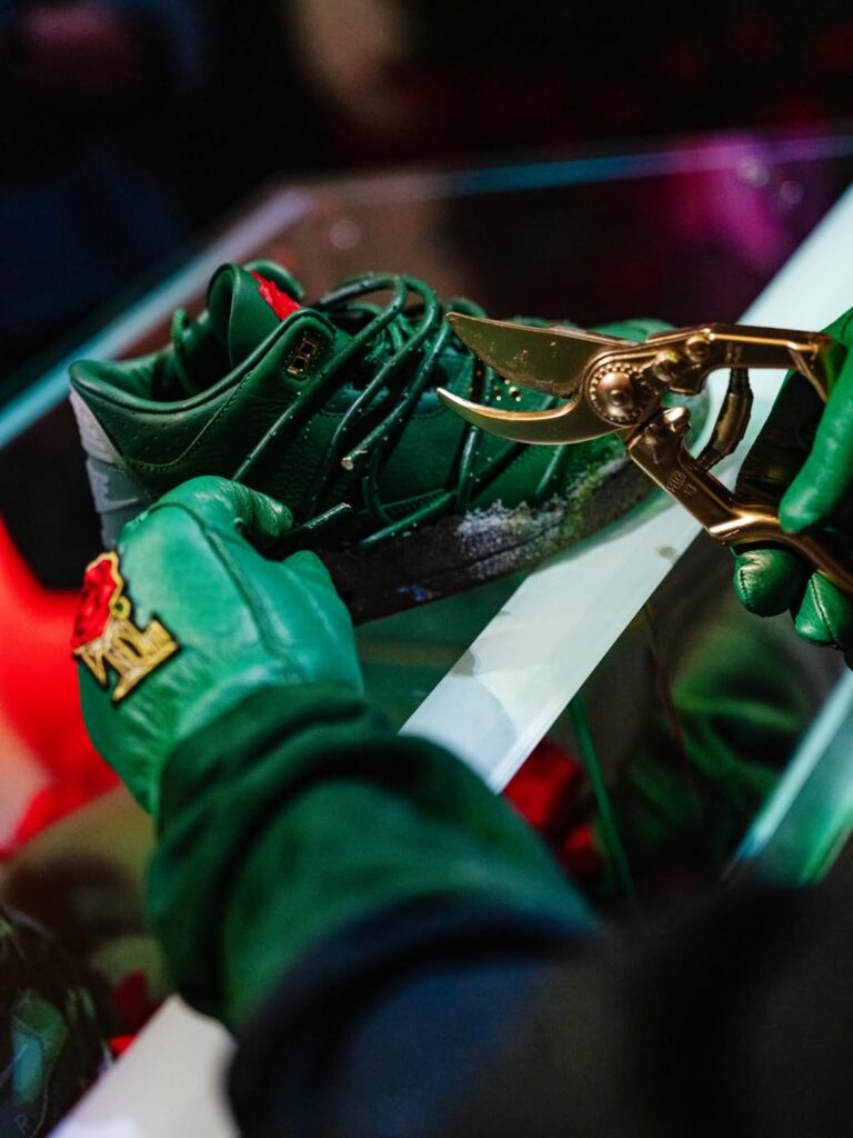 The pair features prickly green thorn vines wrapping around a matching green-hued leather upper with a concrete-finished midsole, reflecting her journey as a rose emerging from concrete, starting from the bottom and creating a successful career for herself with resilience and perseverance. These vines can be clipped off for a more traditional look, though they cannot be reattached once removed. Additional details include metallic gold eyelets, a gold-colored rose lace charm, and a Fire Red rose emblem on the tongue.