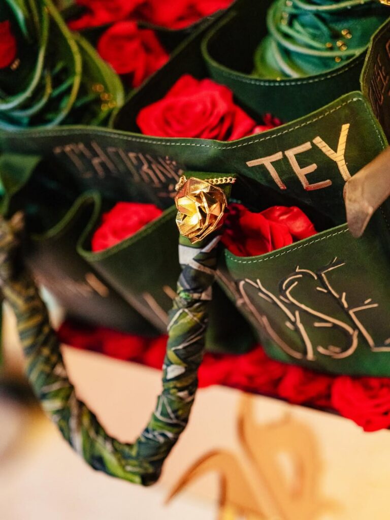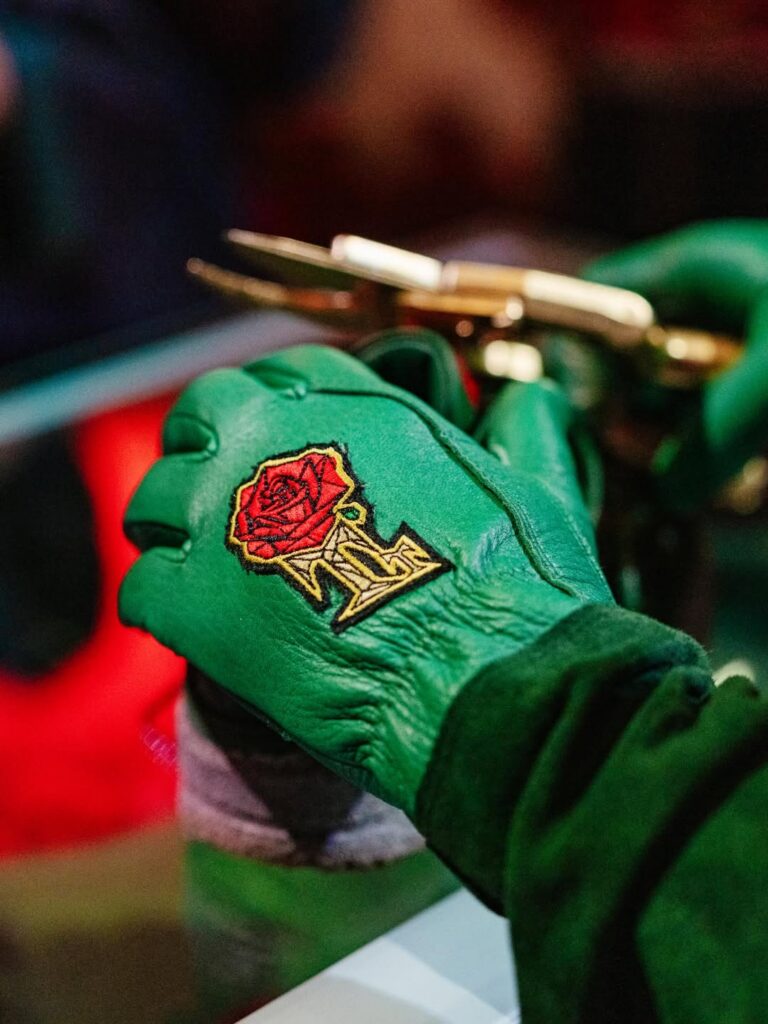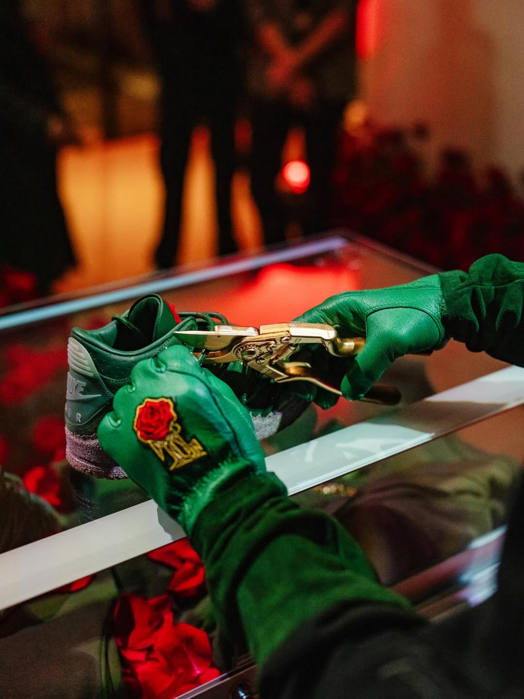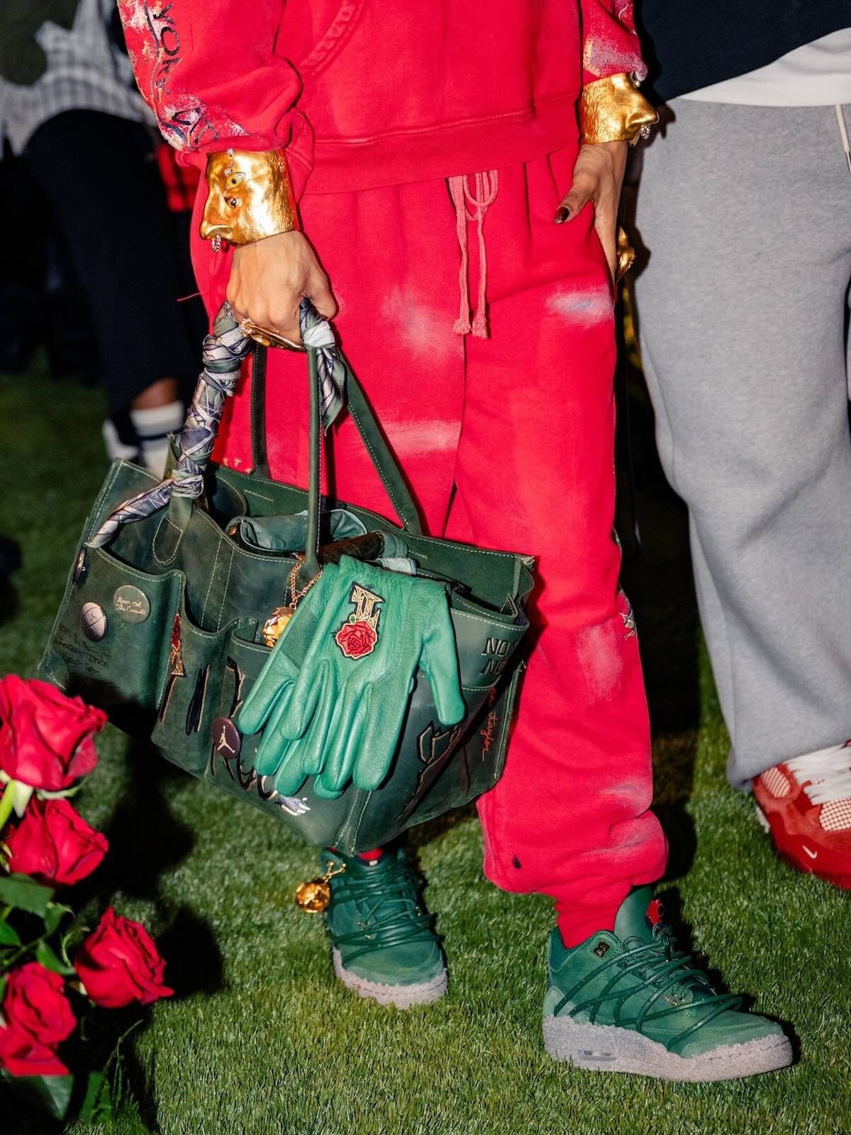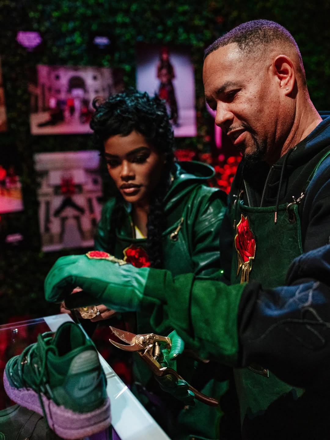 The pair features prickly green thorn vines wrapping around a matching green-hued leather upper with a concrete-finished midsole, reflecting her journey as a rose emerging from concrete, starting from the bottom and creating a successful career for herself with resilience and perseverance. These vines can be clipped off for a more traditional look, though they cannot be reattached once removed. Additional details include metallic gold eyelets, a gold-colored rose lace charm, and a Fire Red rose emblem on the tongue.