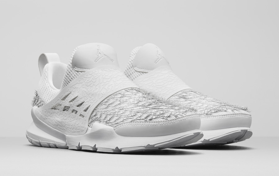 Inspired by the Nike Sock Dart, with a Jumpman feel. Composed of a stretchy upper with easy pull tabs to slip your foot in, a feathered leather on the forefoot, an elephant print midfoot strap to maintain the fitted feel of a sock shoe as well as the option of two color ways, Triple Black and Triple White.