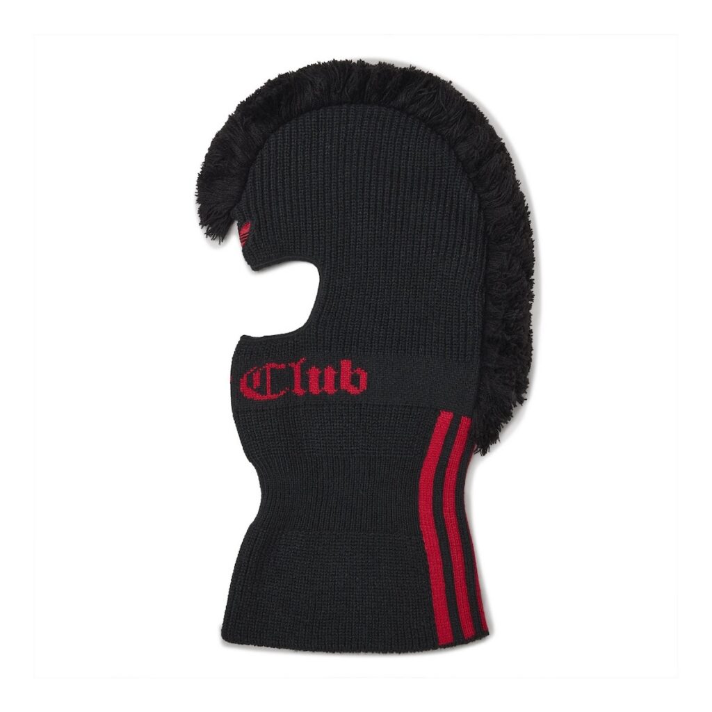 The capsule runs head-to-toe, anchored by the photorealistic metal-rivet graphics that have become a Thug Club signature. The Superstar Jacket leads the apparel line with a detachable padded vest constructed from an all-over rivet print, paired with matching joggers. The Sweat Hoodie is executed in French terry with a garment-dyed finish and an unexpected bone-shaped tuck detail at the back, available in red and gray, both paired with sweat jorts. Rounding out the apparel is a long-sleeve top inspired by the archive Predator goalie jersey, offered in black and off-white, and a balaclava with fringed detailing.