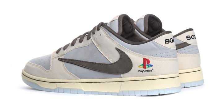 More notably, a raffle for a Travis Scott x PS5 x Nike Dunk Low giveaway is also found on the webstore, limited to five winners. The shoe comes in a color scheme inspired by the original Playstation mixed with the signature Cactus Jack brown. A Playstation logo is embroidered on each lateral heel, with the left shoe featuring English writing and the right shoe Japanese. The Nike branding on the tongue and the Playstation branding on the outsoles also follow this mismatched language theme.