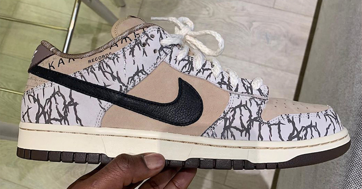 This sample features a similar construction to the actual retail release with familiar beige suede panels and black Swoosh. The main difference is the lack of paisley and plaid cloth overlays. In their place is a Cactus Jack-style cement print overlay, which remained hidden under the paisley in the retail version. The outsole color is also different, opting for a dark brown instead of a beige that matches the upper.