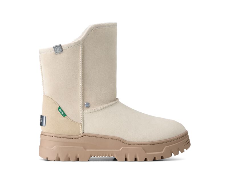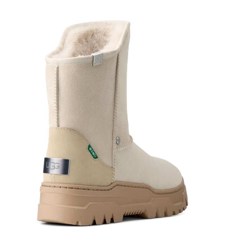 The Boot is a reimagined take of UGG’s Classic Short. Hidden pushes the soft staple into more industrial territory, adding a rugged lug outsole, a metal heel plate, and a crampon-inspired hardware that gives the silhouette a tougher, gear-forward edge without losing its recognizable shape.