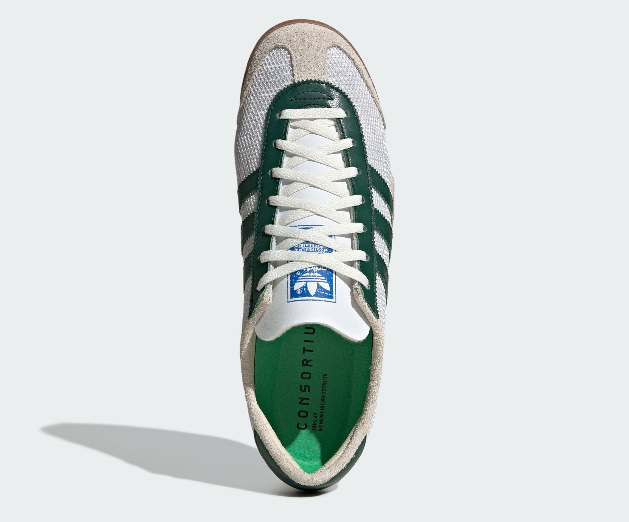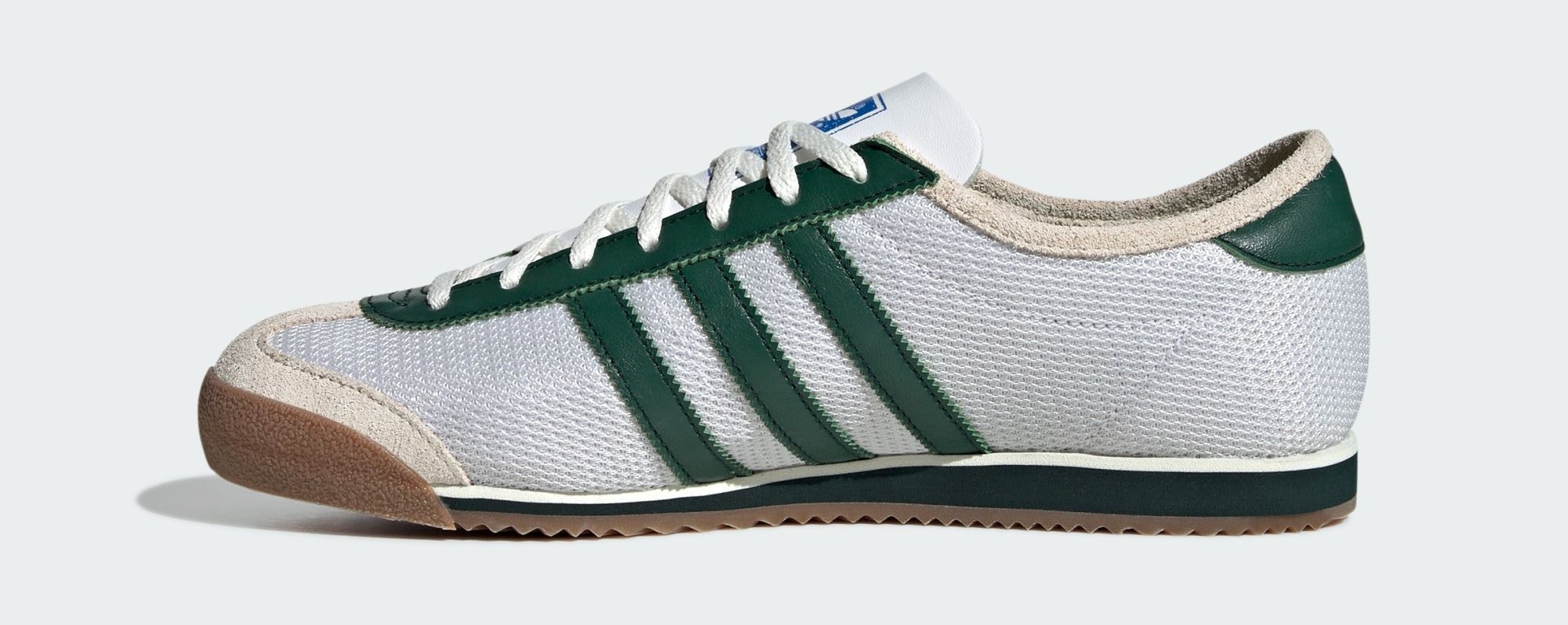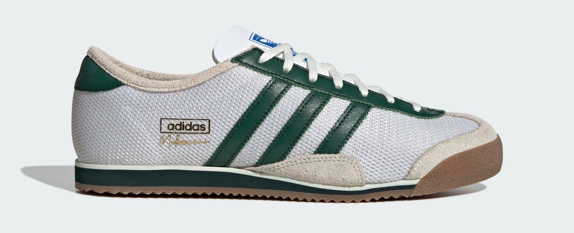 Dubbed the adidas Melbourne, the shoe’s design nods to Aussie tennis legend Rod Laver with a mesh upper pulled from his 1970 signature shoe, paired with details from a running spike used during the 1956 Melbourne Olympics. The spike’s white and green hues are reflected in the colorway, giving the silhouette a vintage feel. Additionally, the foam tongue pays homage to the Australian-made adidas Rome, featuring a worn tag reading “MADE BY UP THERE.” Other key details include a padded leather lining, a performance insole, and three lace options with tips in Up There’s signature bright green.