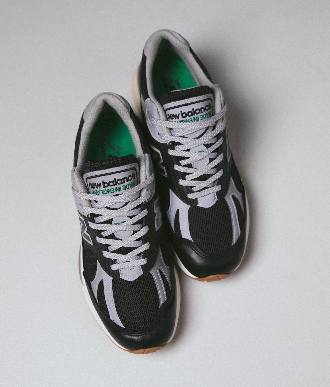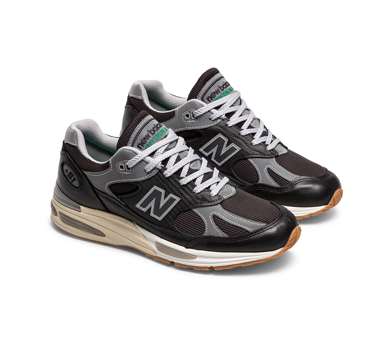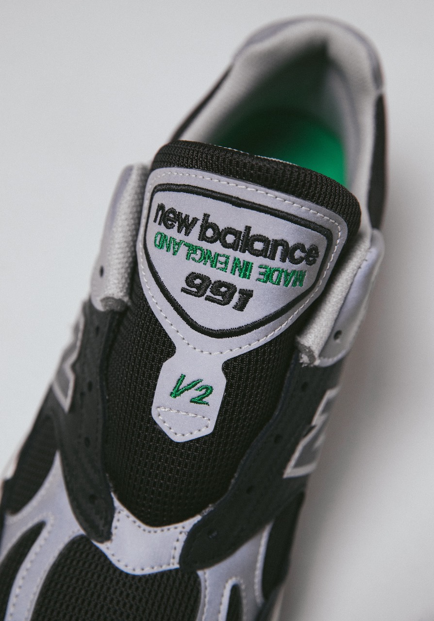 In partnership with New Balance designer Sam Pearce, this 991v2 is crafted with new material and design elements, elevating the silhouette to greater heights. Performance meshes combine with carbon-effect leather for a technical edge, whilst full-grain leather overlays provide a luxury contrast. The white and cream midsole features translucent SBS pods and heel caps, paired with a timeless gum outsole. The palette of black and reflective silver hues are interrupted by flashes of Up There’s signature green on the tongues, heels, and outsoles.