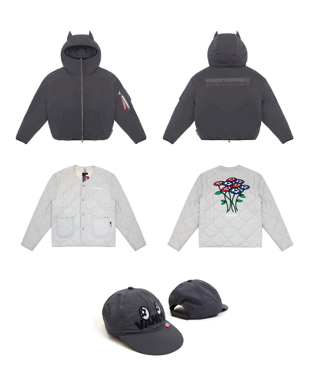 Inspired by the energy of city nights, the collection centers on two statement jackets and a co-branded baseball cap. The black puffer jacket puts a whimsical spin on Alpha’s iconic bomber, featuring pointy ears attached to the hood in a nod to Batman-inspired iconography. The second piece, a grey quilted liner jacket, leans into VANDYTHEPINK’s signature motifs with a bold floral graphic across the back, spotlighting the brand’s recurring flower design.