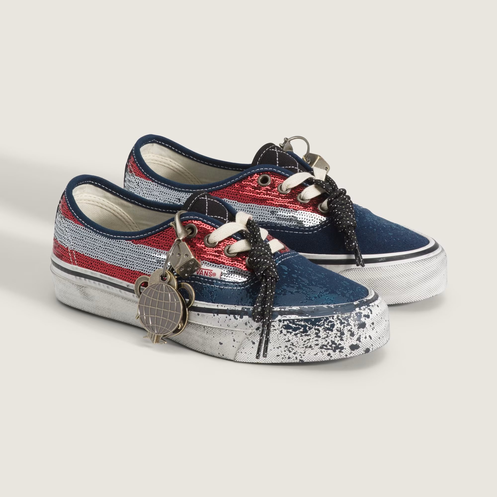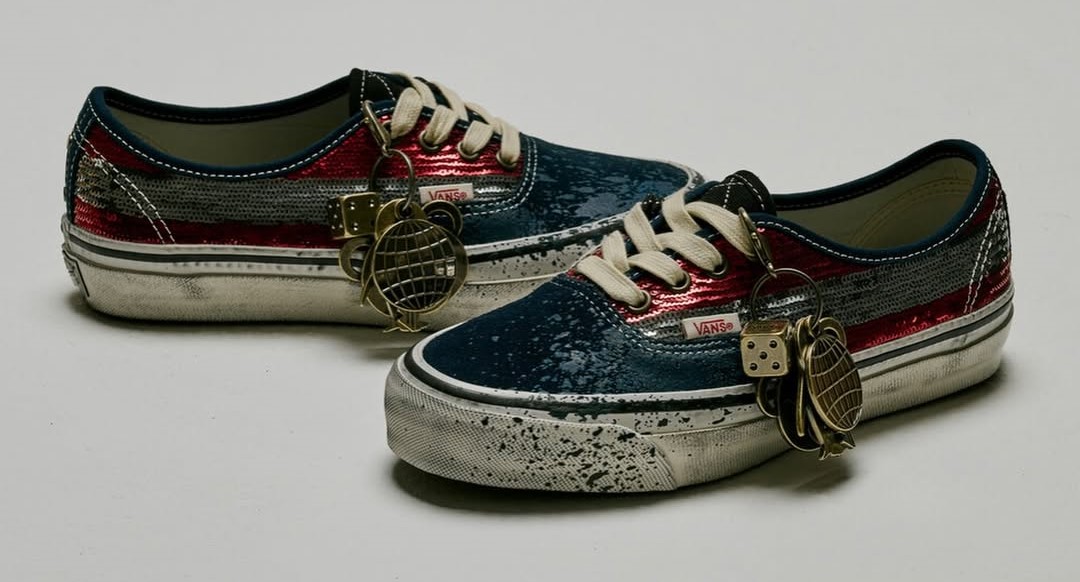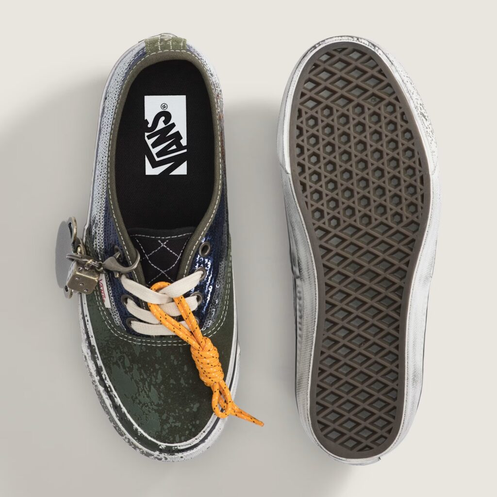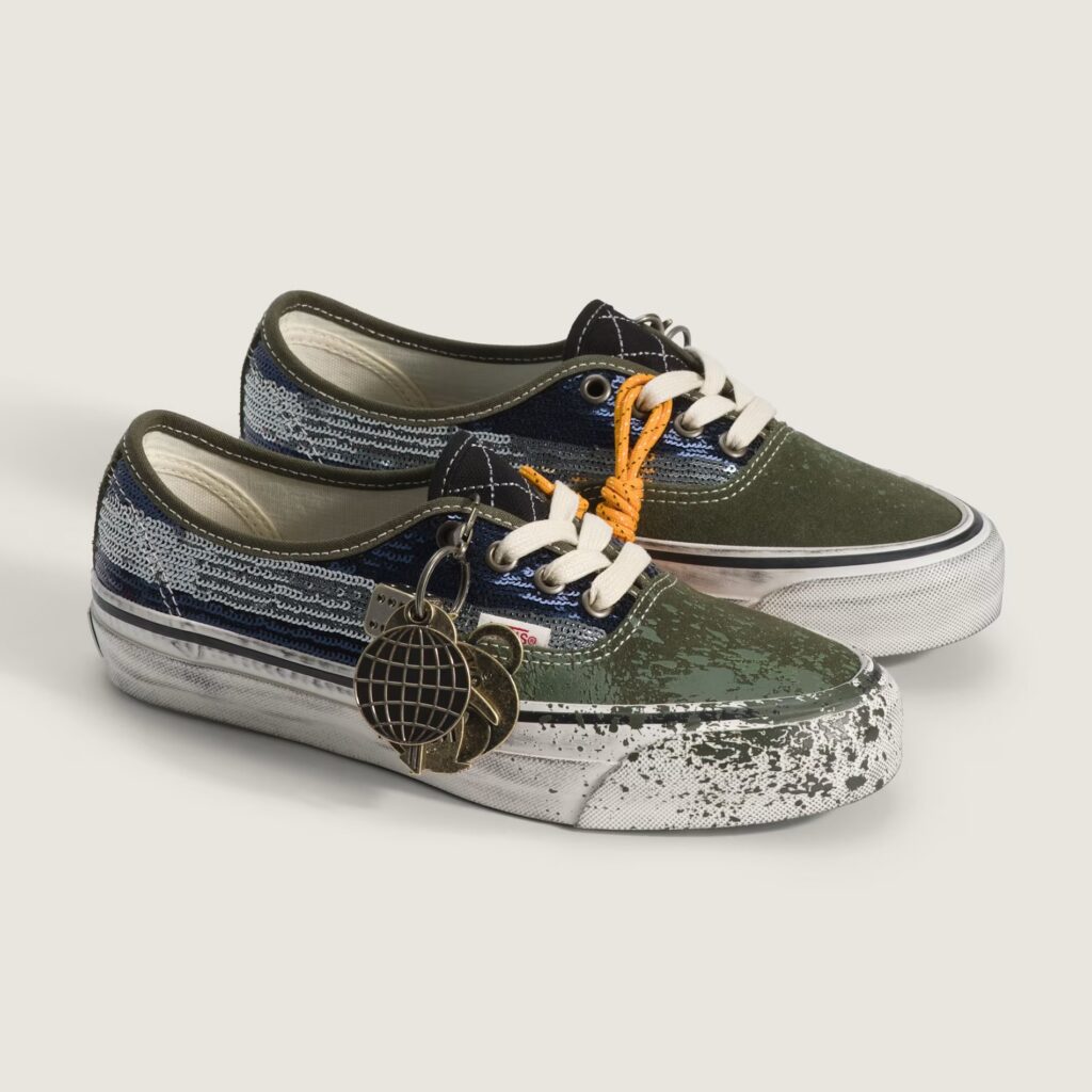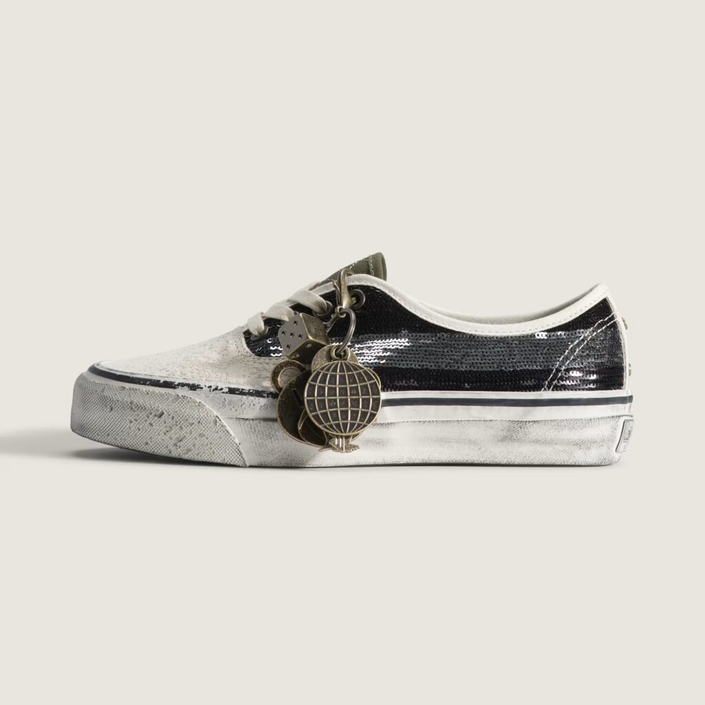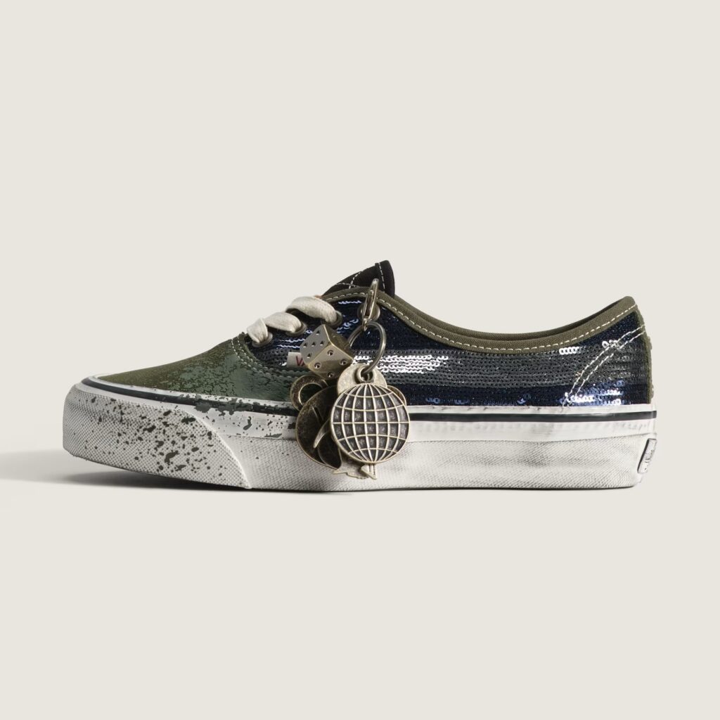 The collection centers on self-expression and unexpected pairings. The pack is led by the LX Authentic 44 Charms, which introduces removable keepsakes and elevated material choices while maintaining a worn-in, travel-inspired aesthetic. It features distressed sidewalls for a vintage look, paired with sequin-striped sides and paint splatter on the toe. Additional design elements include a suede toe cap, metal bolts on the spine, and bright hiking laces, which serve as an additional accessory alongside the gunmetal keychain charms, further reinforcing the shoe’s emphasis on customization and travel theme.