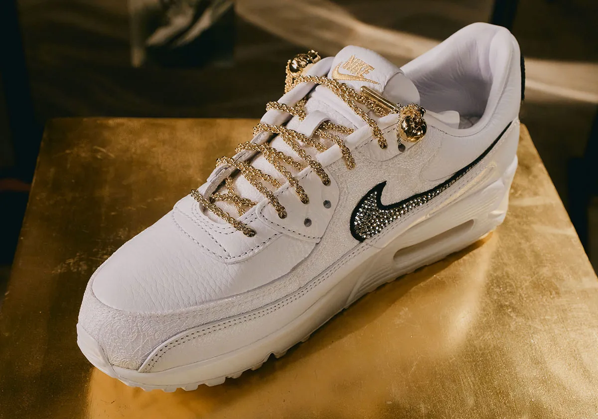 The Air Max 90 “Downtown Diamond District” nods to the historic jewelry hub where Solomon learned the craft that molded his practice, and a key feature on the shoe is that the swoosh is, of course, stone-crusted.