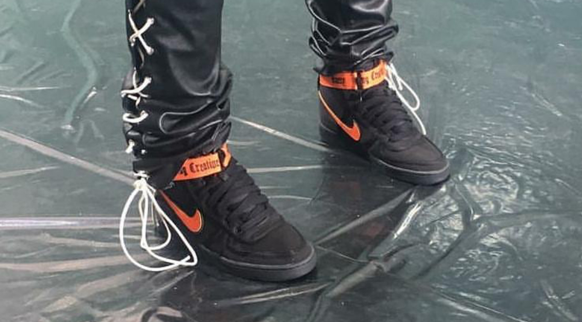 Not only did A$AP Bari preview the Nike Air Force 1 High x Vlone on foot, but models who wore the VLONE footwear line also gave a preview of the upcoming SS 17-18 line. Included in the VLONE collection is the return of the Nike Vandal that will also feature a black and orange theme, with Every Living Creative Dies Alone on the strap. No word on when these will be releasing but stay tuned with Modern Notoriety for more news on the Nike x VLONE line.