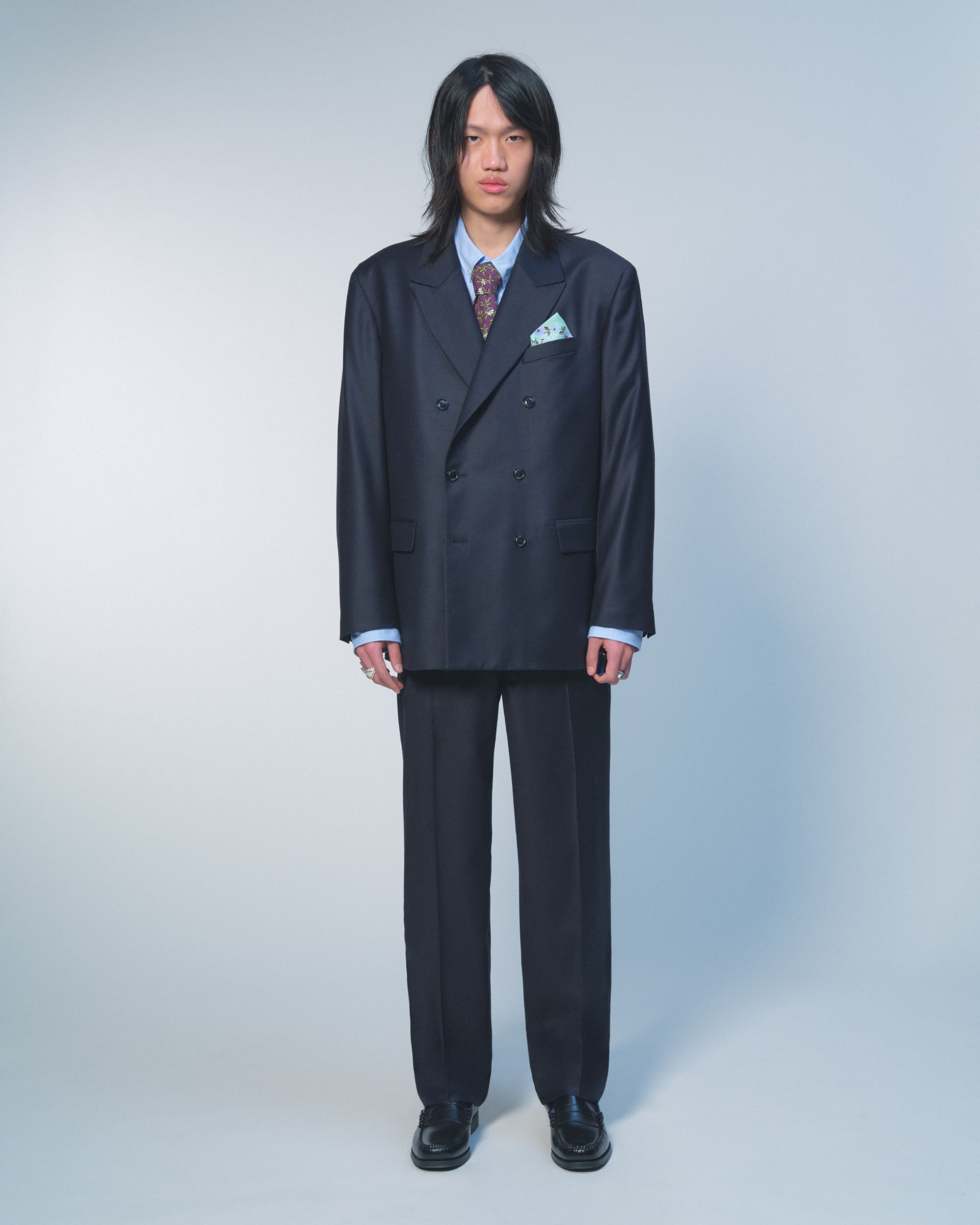 The collection itself balances formal structure and daily wearability. Tailoring is a key anchor, with double-breasted suits and matching overcoats shaping the more elevated side of the wardrobe, while woven shirting, denim, and knitwear keep the lineup grounded. Outerwear carries some of the strongest seasonal range too, corduroy trucker jackets for early fall transitions, and two-tone shell jackets built for harsher weather shifts. The brand’s recognizable staple, the knitted bomber, returns, and this time it’s reworked with pink, purple, and green camouflage treatments.
