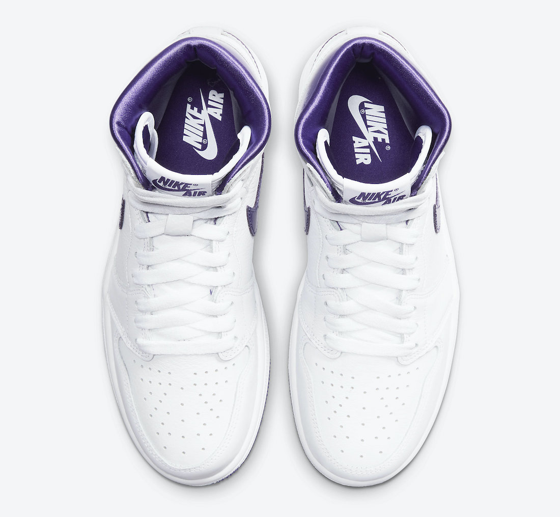 Dressed in the same white and purple colorblocking as the OG release, this AJ1 comes dressed in white leather with purple patent leather used for the Swoosh and ankle collar. One of the main differences from the OG pair is that this release opts for a satin sockliner, adding a bit of extra shine for that “metallic” aesthetic. the upper sits atop a white midsole and purple rubber outsole.