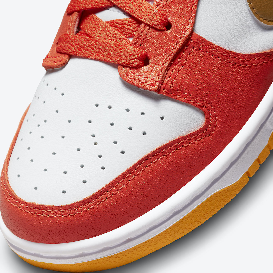 Starting with the Dunk Low, this colorway features a white leather upper, orange leather overlays, a Laser Orange outsole, and a metallic gold Swoosh. The Dunk High also comes with a white leather upper and gold Swoosh, though the colors of the overlays and outsole are inverted when compared to the Dunk Low.
