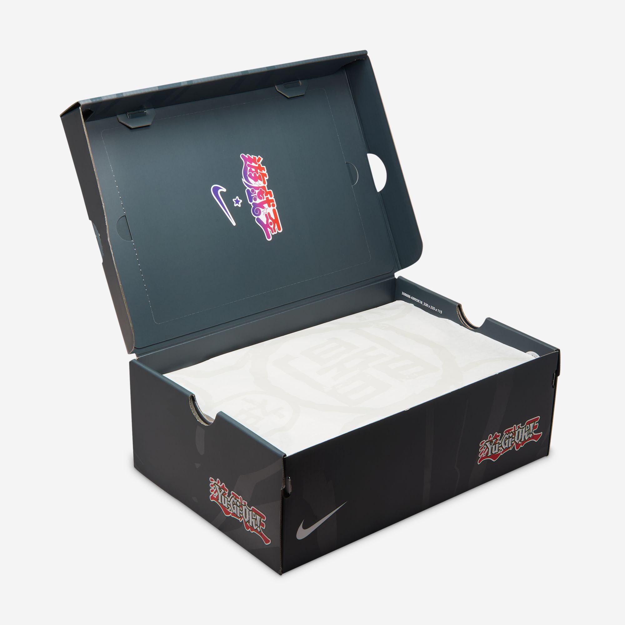 Headlining the project from Nike’s .SWOOSH division is the Air Max 95 “Joey,” inspired by Joey Wheeler’s “Air Muscle” sneakers from the show — which itself is an homage to the Air Max 95. The pair arrives in blue hues just like Joey’s, with “air muscle” tongue branding replacing the classic “air max.” Manga-style halftone shading runs across the uppers, while scratch-mark graphics pulled straight from the anime appear on the midsoles and rear Air units. Co-branding on the back of the heels nods to the copyright text on Yu-Gi-Oh! trading cards, while the outsoles are adorned with a Yu-Gi-Oh! logo and TCG-inspired print. Joey and his Red-Eyes Black Dragon are featured on the insoles and special packaging, and each pair comes with an exclusive Spell Card, Winds of Victory.