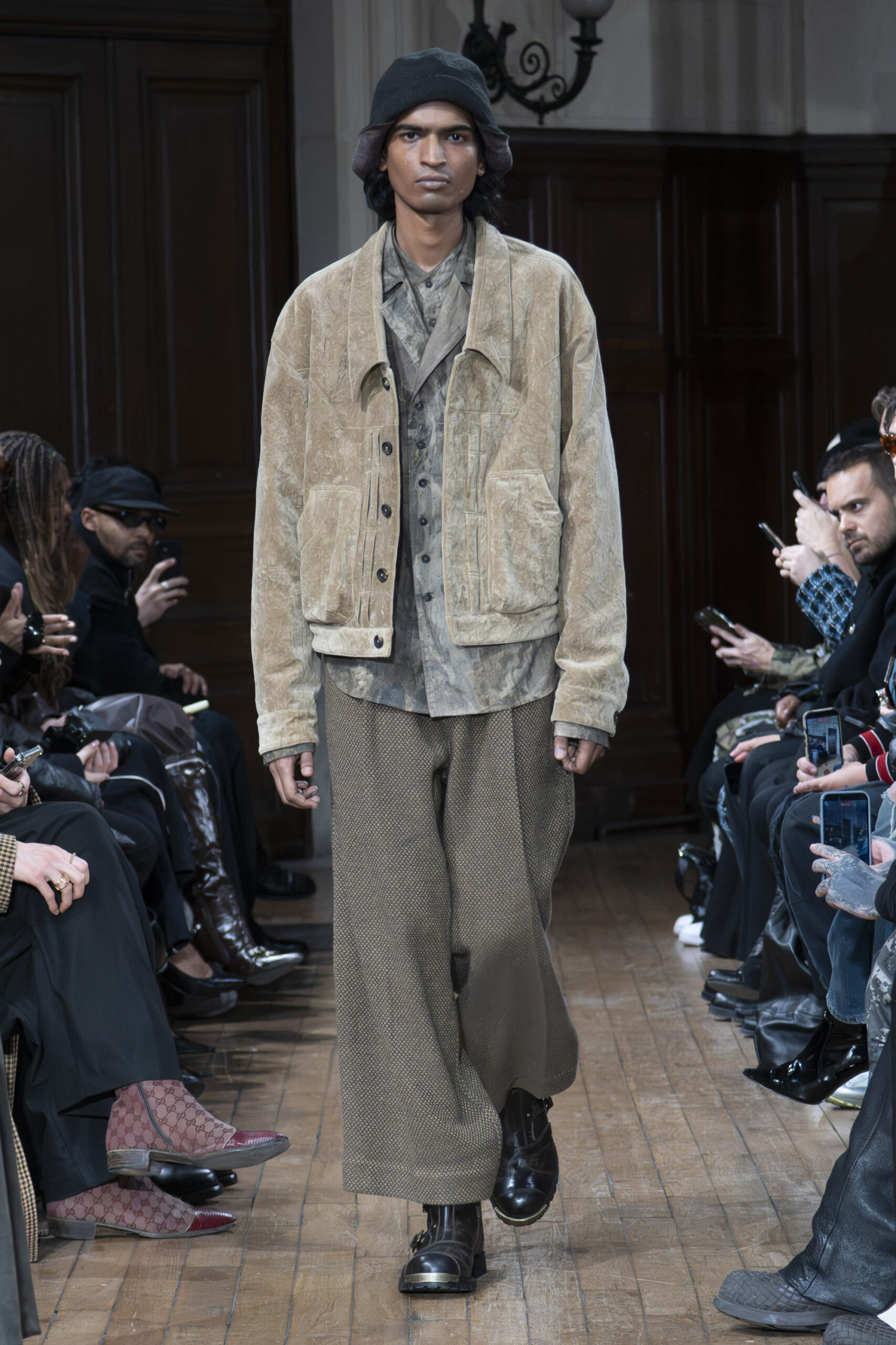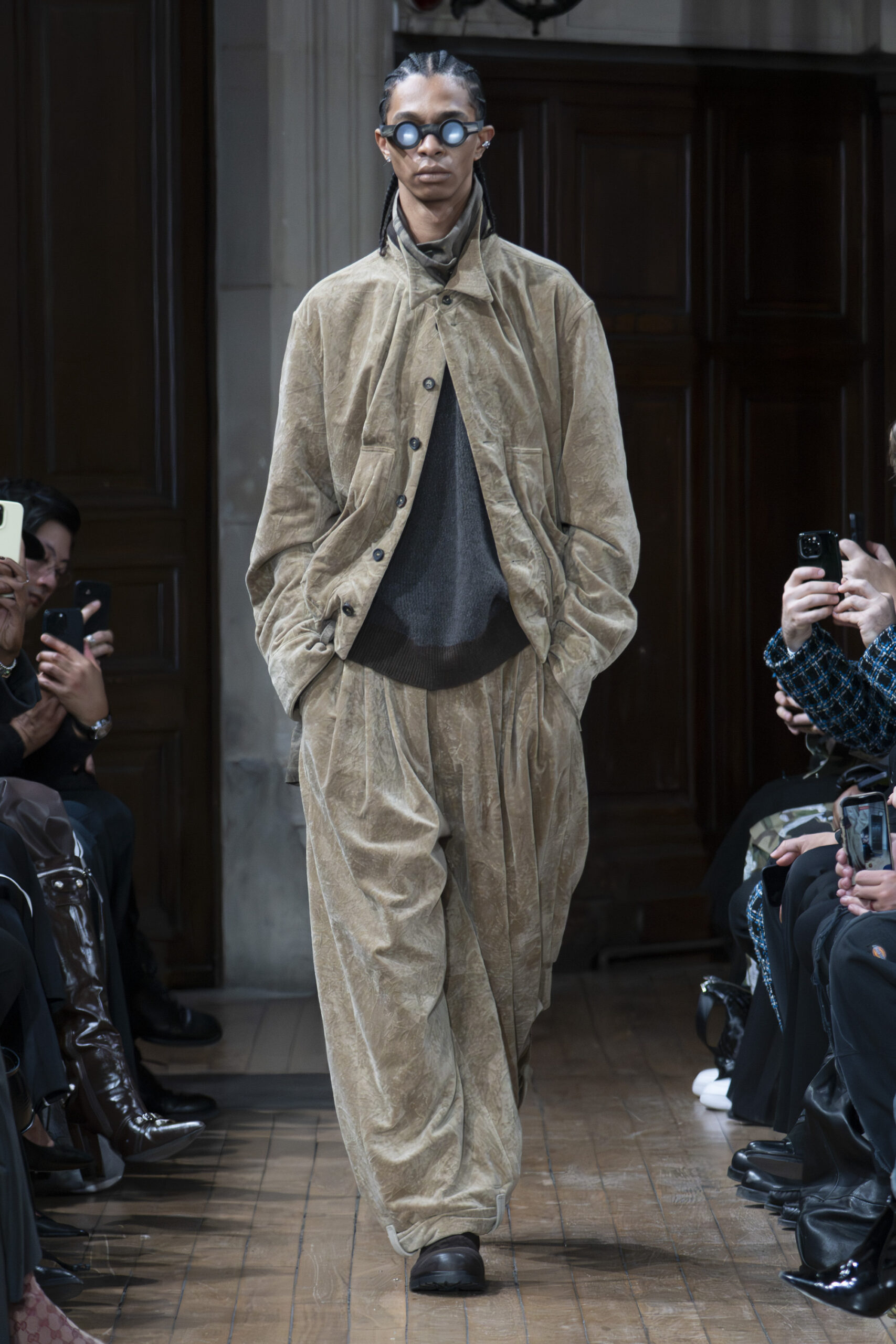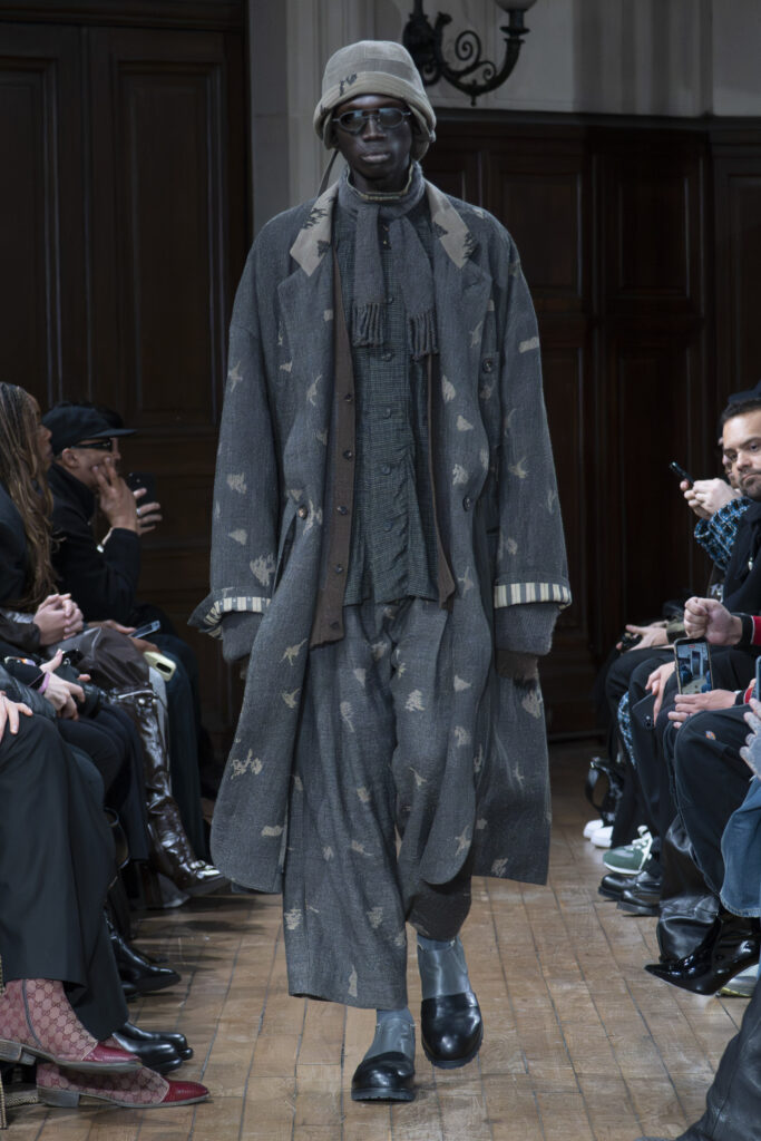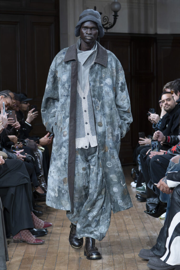 Shown during Men’s Paris Fashion Week, the “DISSPARATION” collection is filled with elongated, softly structured tailoring, a muted palette of greys, browns, and blue-black tones that feel worn-in, and patterns inspired by hand-drawn marks and abstracted memories of stone, architecture, and historical imagery.