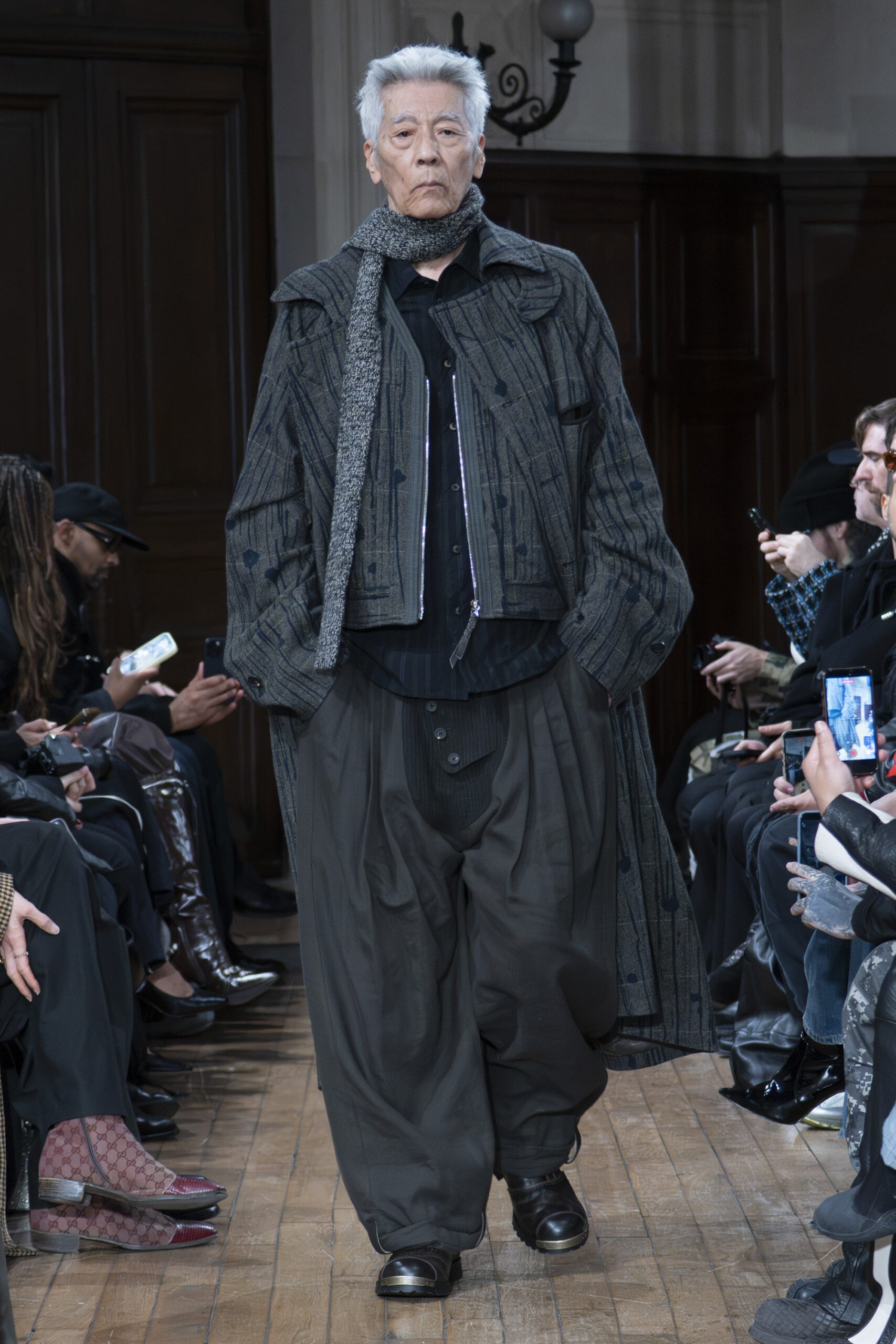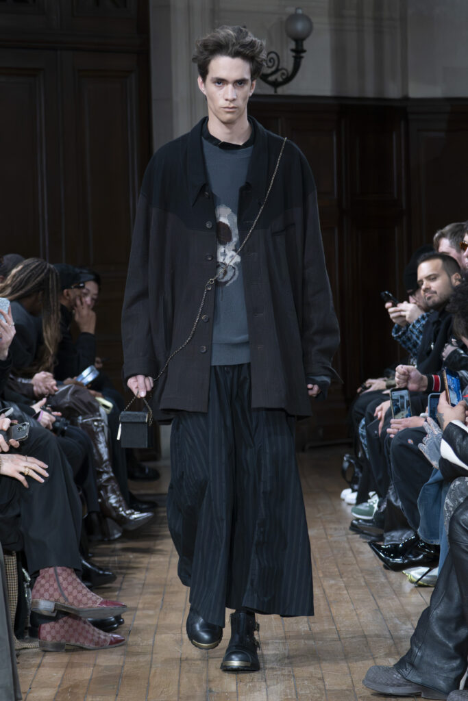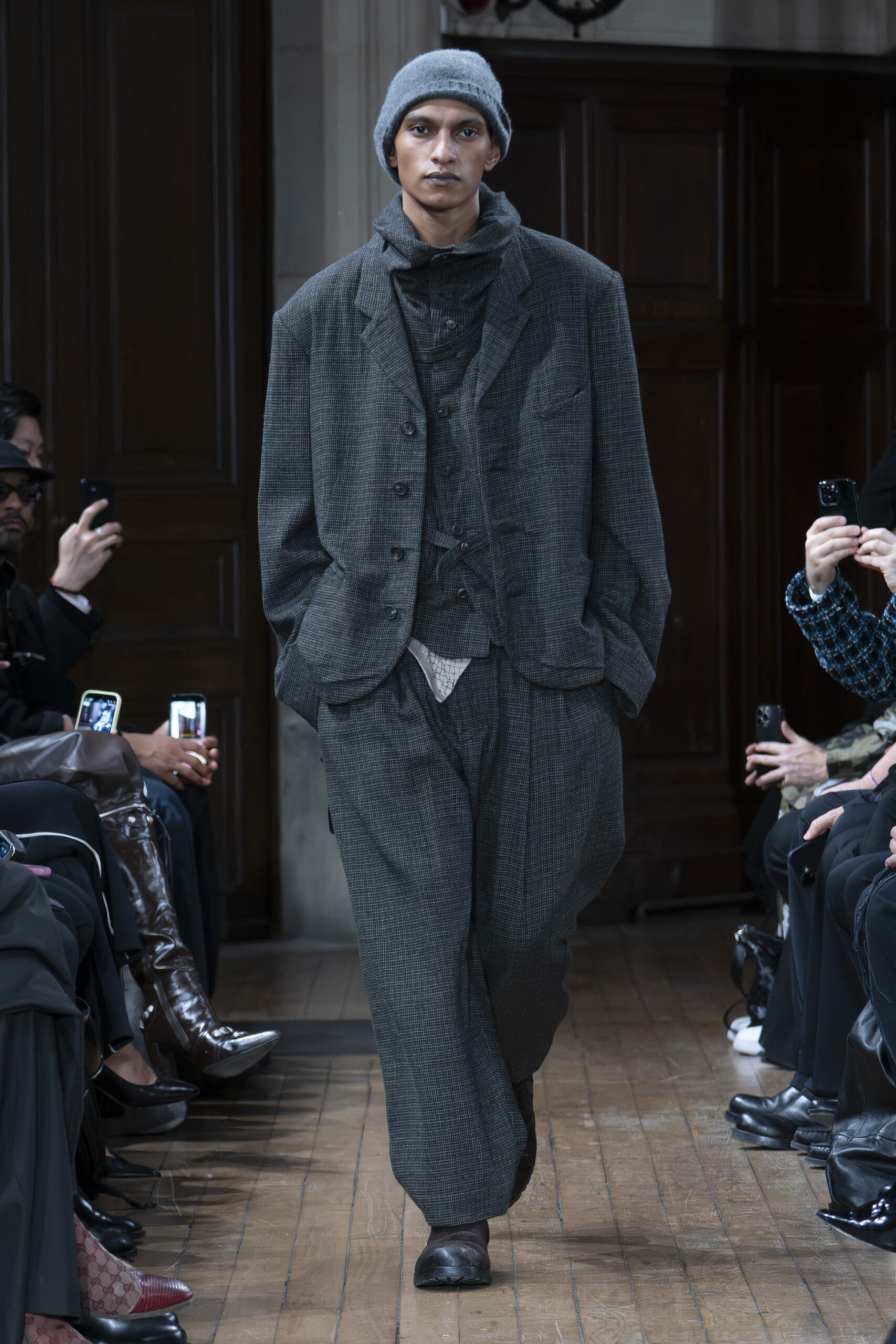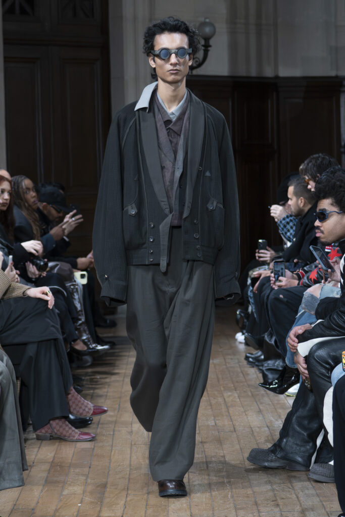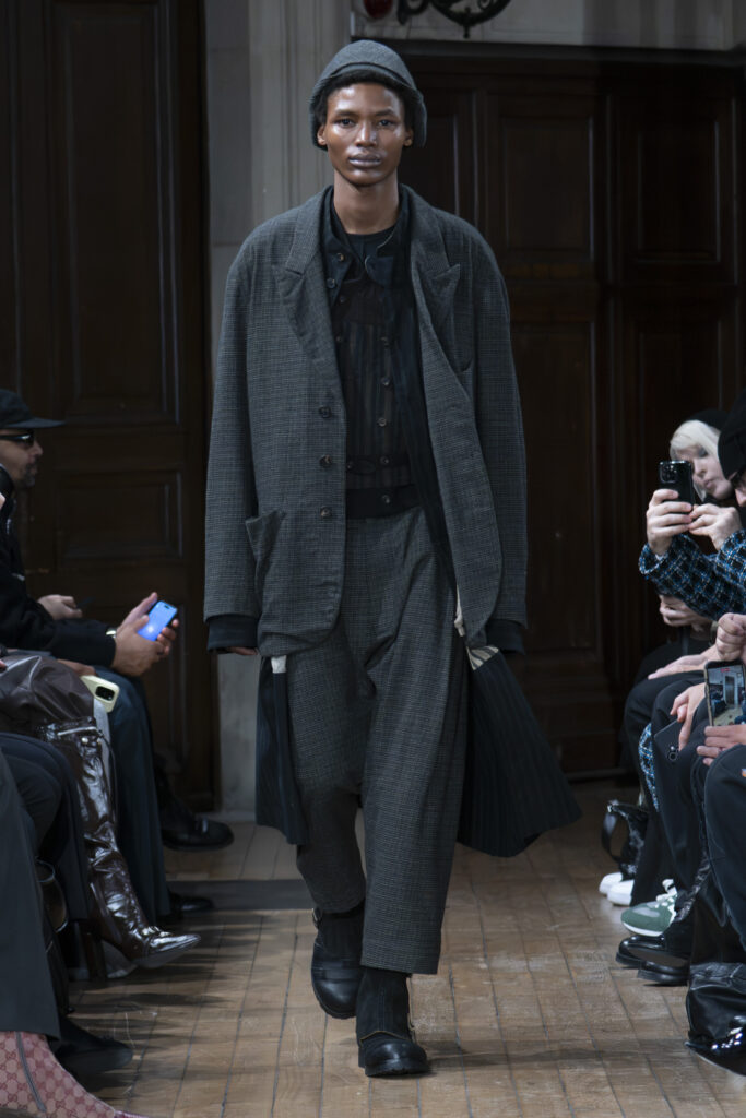 Shown during Men’s Paris Fashion Week, the “DISSPARATION” collection is filled with elongated, softly structured tailoring, a muted palette of greys, browns, and blue-black tones that feel worn-in, and patterns inspired by hand-drawn marks and abstracted memories of stone, architecture, and historical imagery.